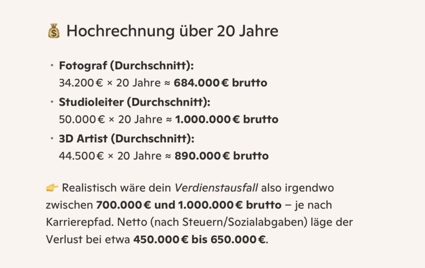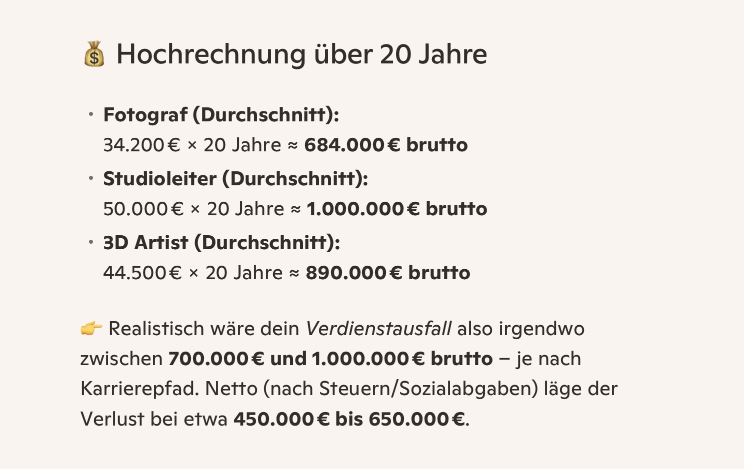Dein Ausfall bewegt sich grob zwischen 700k und 1 Mio. brutto über 20 Jahre. Das zeigt, wie groß die Lücke sein kann – aber auch, dass deine Skills (Fotografie + 3D + Gestaltung) heute noch wertvoll sind, gerade in Kombination mit KI-Tools und moderner Medienproduktion.